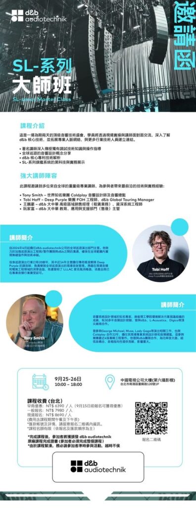 #dbaudio_news 【台北SL-系列大師班 | 兩天解鎖音響技術巔峰,與全球大咖面對面】這是一場為期兩天的頂級音響技術盛會,學員將透過現場實操與講師面對面交流,深入了解 d&b 核心技術,並拓展專業人脈網絡,與更多行業技術人員建立連結。課程亮點• 著名講...