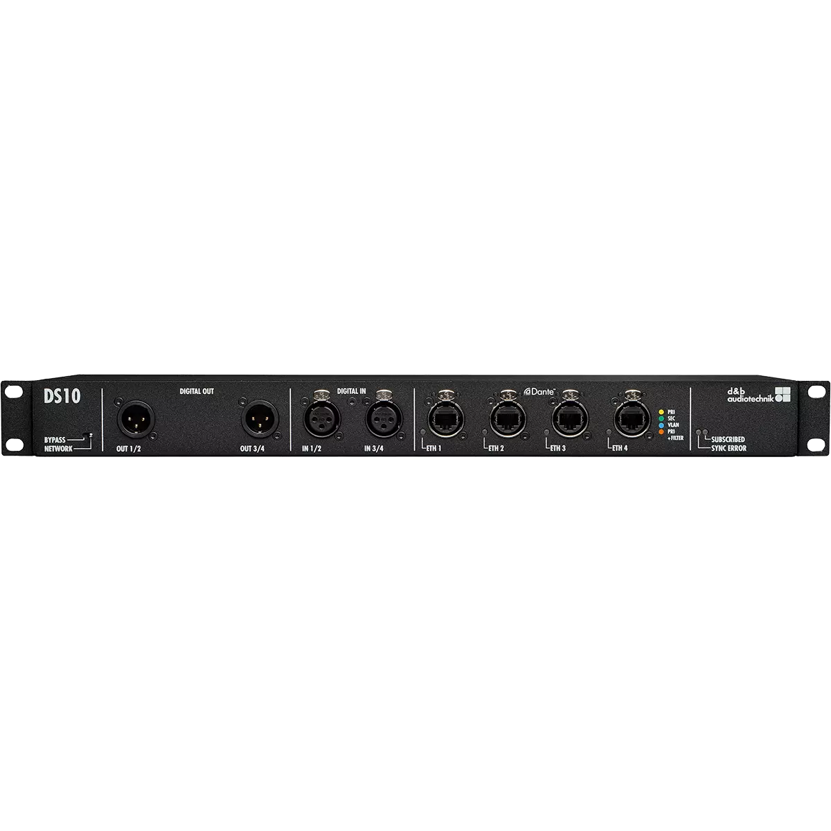 DS10音訊網路橋接器連接Dante網路和AES3數位音訊訊號,同時也提供乙太網路控制資料的分發。 DS10位於數位擴大機前端的訊號連結當中,此1RU的設備擴展了流動和固定安裝環境中的d&b系統方法,每個單元可透過AES3數位訊號輸出提供多達16個Dante網路通道。來自DS10的AES3通道資料流將載有Dante通道標籤和接線資訊的元資料傳送至d&b四通道數位擴大機。另外,四個AES3輸入通道提供訊號輸入至Dante網路傳輸,可應用於例如作為來自FOH混音器輸入的介面盒使用。